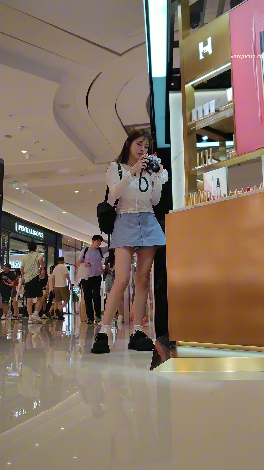 XM306蓝色裤裙美女商场一边走路一边拍照,白色内内