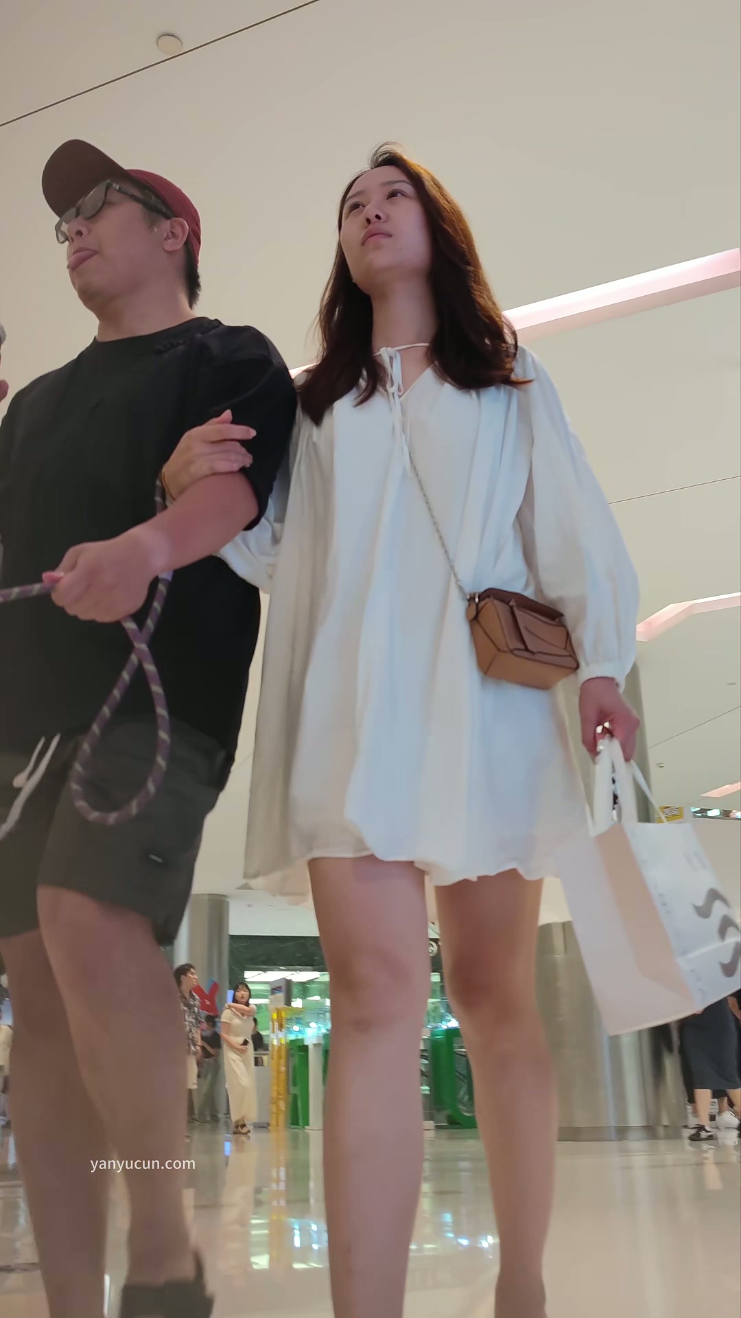 XM323白色连衣裙美女和老公牵着小狗逛街,白色内内 ...