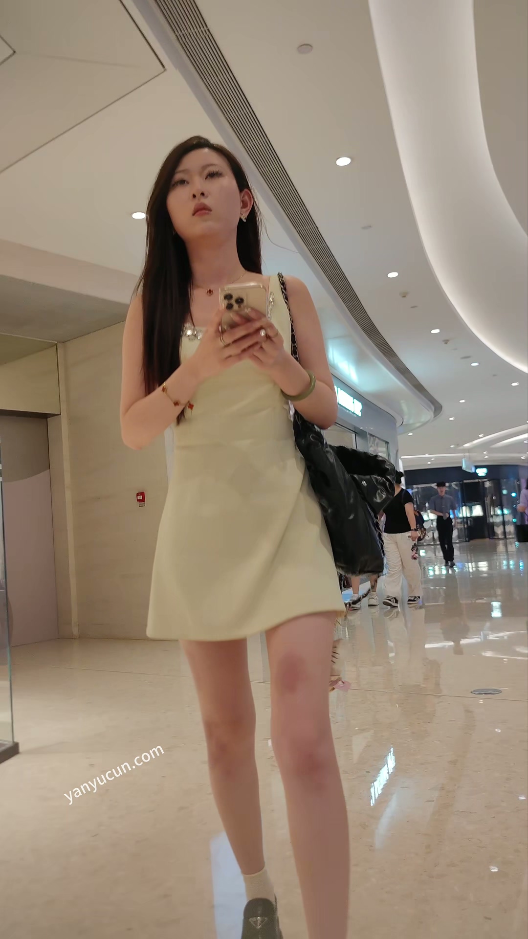 XM391黄色连衣裙美女和朋友们逛街,白色内内漏毛