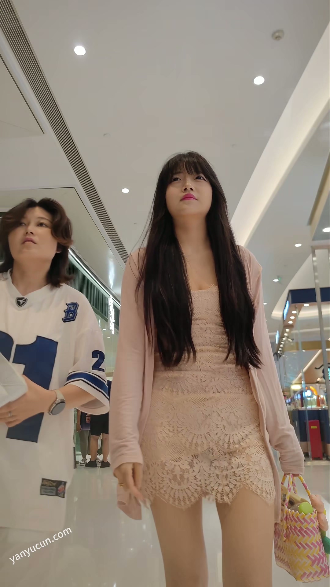 XM399粉色包臀裙小姐姐和闺蜜逛街,白色内内